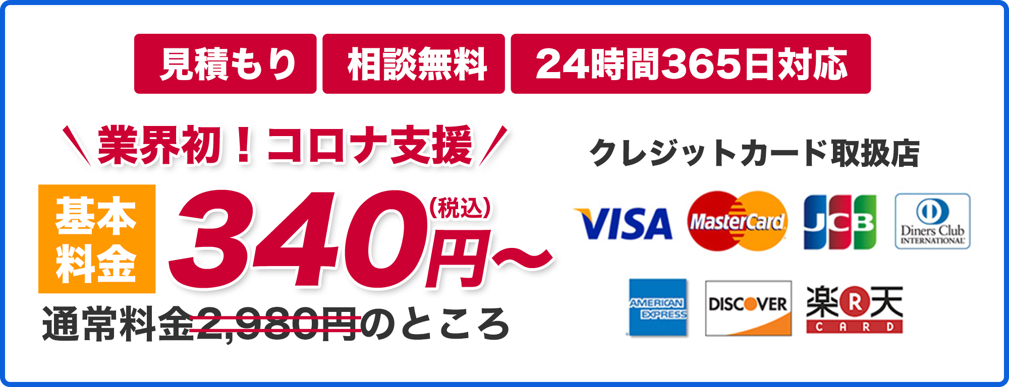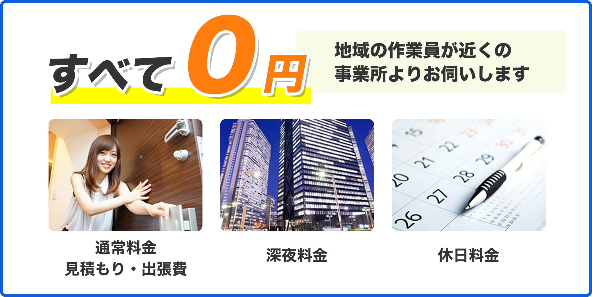 休日や深夜の割増料金についても一切不要でご対応しています。初めての方もお気軽にご連絡ください。